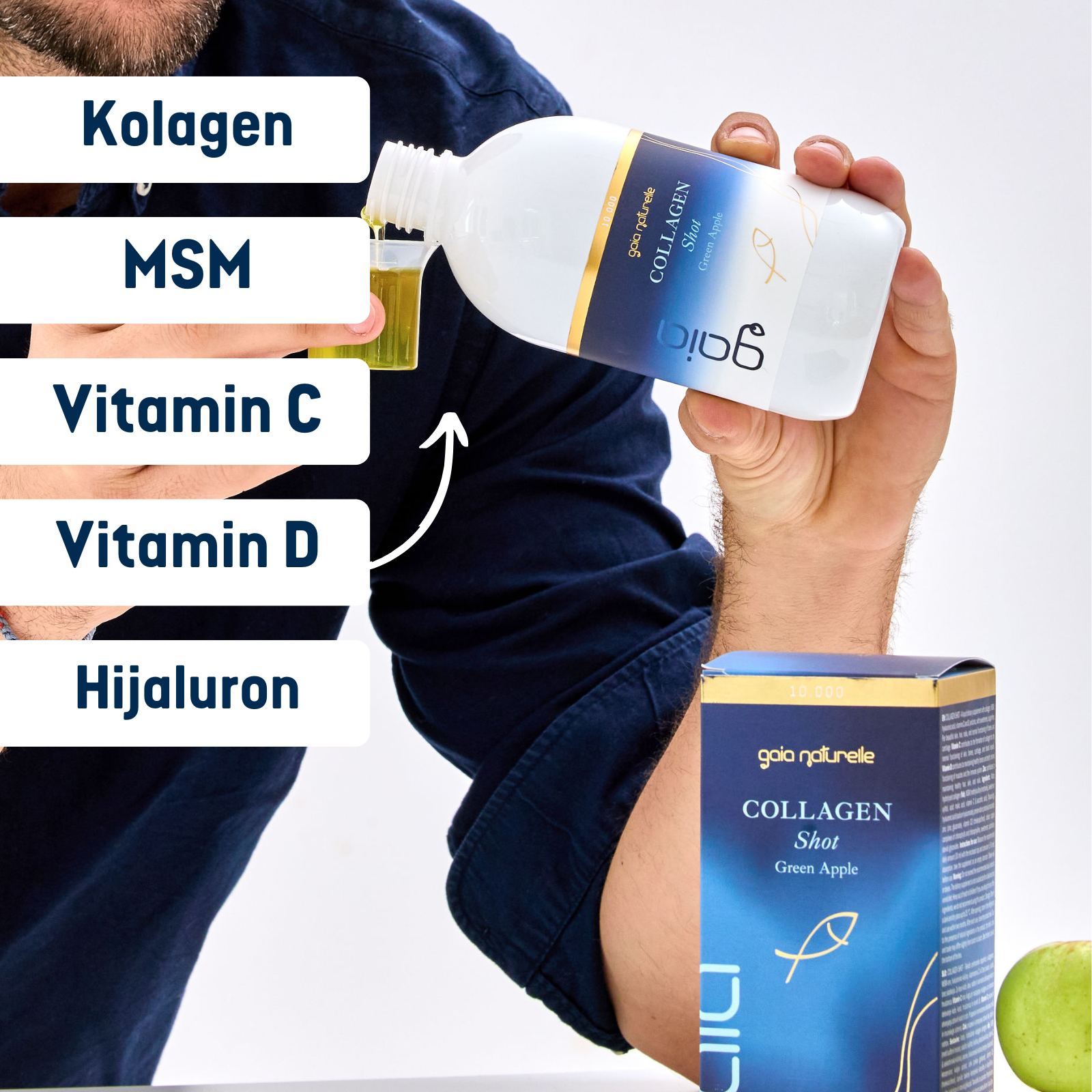 Voda, hidrolizirani kolagen (alergen: ribe), MSM (metil sulfonil metan), sladilo: ksilitol, kiselina: jabučna kiselina, vitamin C (L-askorbinska kiselina), arome, hijaluronska kiselina (natrijev hijaluronat), konzervans: kalijev sorbat, cink (cinkov glukonat), vitamin D3 (kolekalciferol), boje: bakrovi kompleksi klorofila i klorofilina, sladila: sukraloza i steviol glikozid.