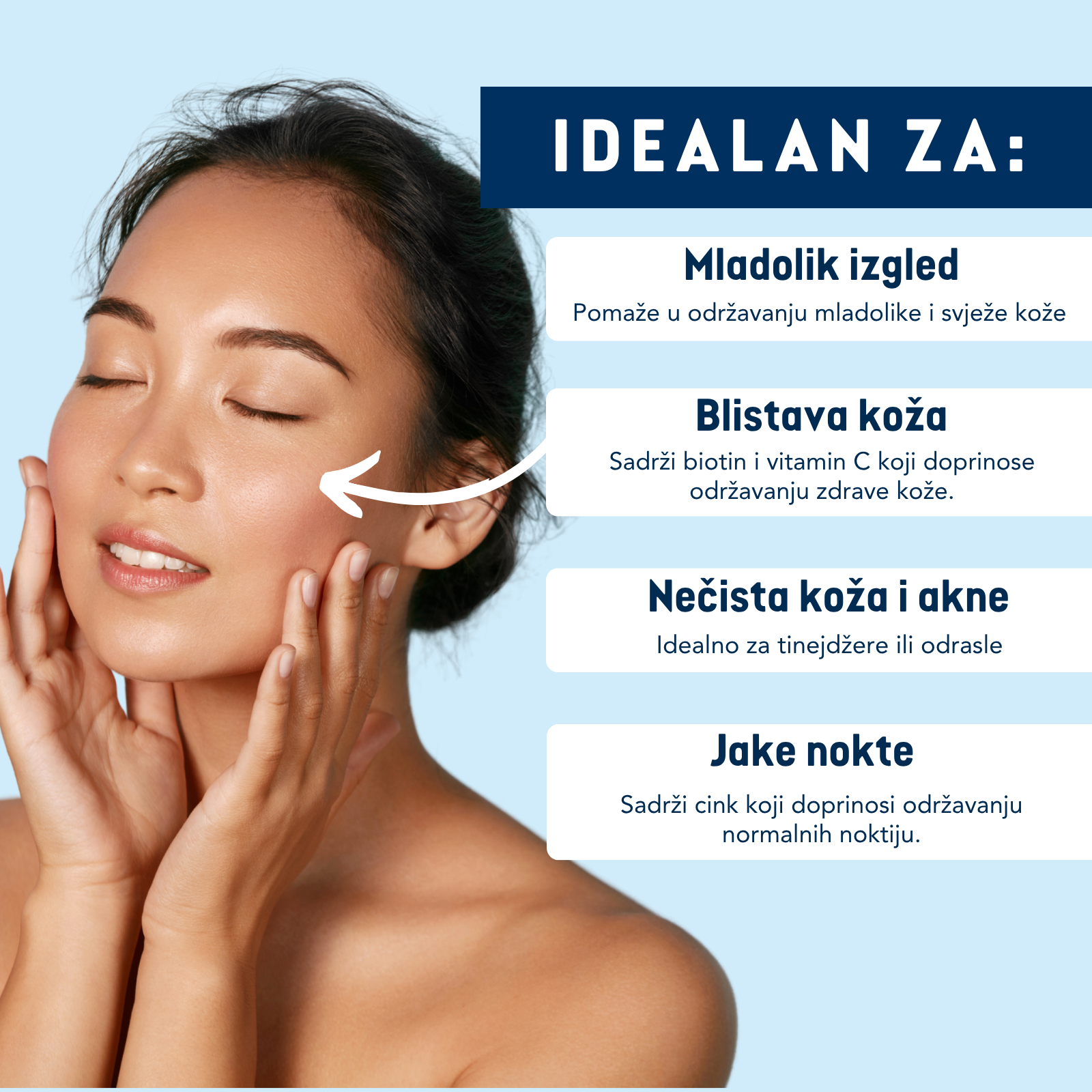Sadrži vitamin C, biotin i cink koji doprinose održavanju zdrave kože.