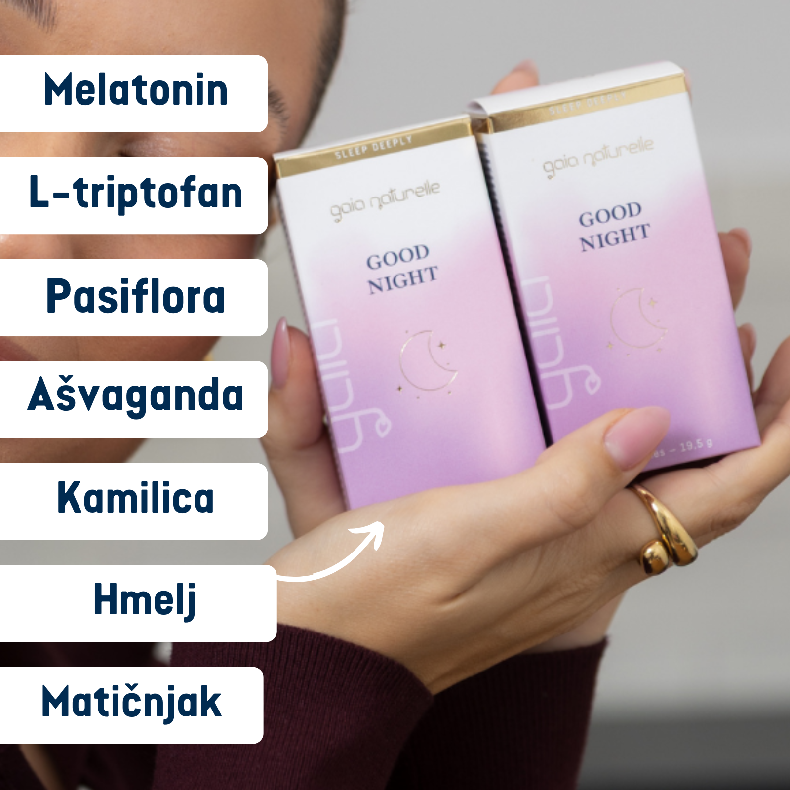 Melatonin doprinosi skraćenju vremena potrebnog da zaspite*, dok vitamini B1 i B6 imaju ulogu u radu živčanog sustava. Ekstrakti kamilice, pasiflore, matičnjaka, hmelja i ašvagande tradicionalno se uključuju u formulacije namijenjene za mirnu večer i kvalitetan odmor.