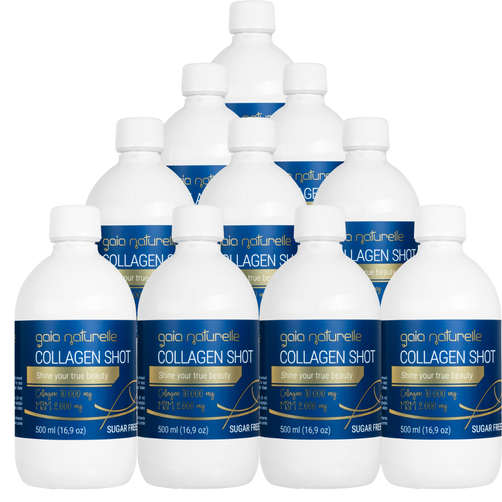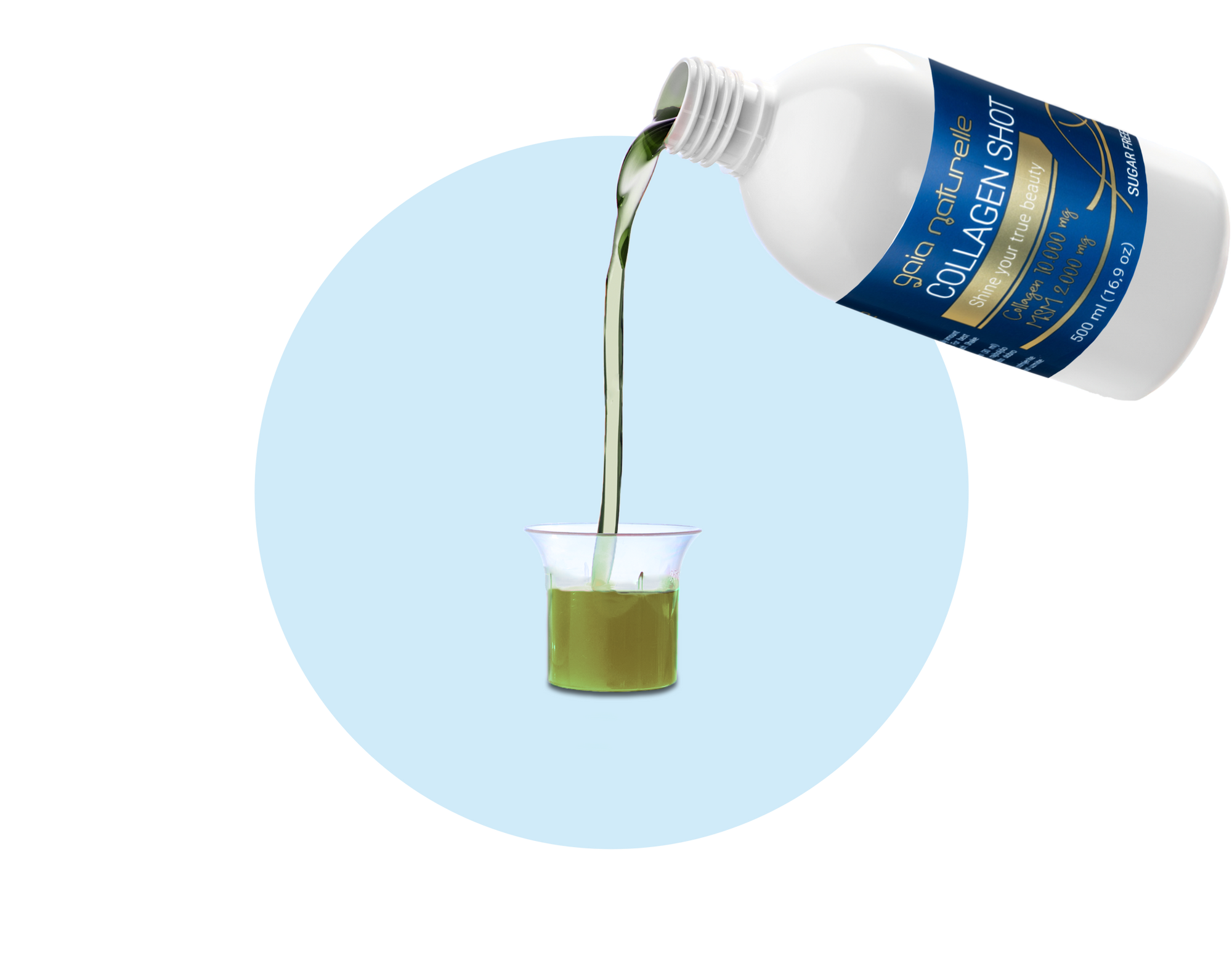 Voda, hidrolizirani kolagen (alergen: ribe), MSM (metil sulfonil metan), sladilo: ksilitol, kiselina: jabučna kiselina, vitamin C (L-askorbinska kiselina), arome, hijaluronska kiselina (natrijev hijaluronat), konzervans: kalijev sorbat, cink (cinkov glukonat), vitamin D3 (kolekalciferol), boje: bakrovi kompleksi klorofila i klorofilina, sladila: sukraloza i steviol glikozid.